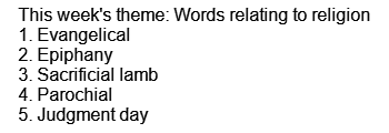 “Faith” is a fine invention For Gentlemen who see! But Microscopes are prudent In an Emergency! Jarrett Gonzales, Tokyo, Japan From: Elliott Berger (eberger compuserve.com) Subject: Re: A.Word.A.Day--evangelical Great gedankenexperiment. I am constantly struck by the uselessness of prayer. The absurdity of seeking god’s benevolence is especially clear every time a tornado or hurricane demolishes a church. Did god do that because that congregation did not pray sincerely enough, or because god is malevolent and vengeful (certainly true if you study the Bible), or because we live on a planet that is a killing machine? When you consider the earthquakes, floods, fires, droughts, tornadoes, tsunamis, heat domes, plagues, diseases, epidemics, etc., not to mention asteroid impacts, colliding planets and moons, and the sun extinguishing itself in the next five billion years, what other conclusion can you draw but that our universe is random and dangerous? Elliott Berger, Indianapolis, Indiana From: Michael Sivertz (sivertz bnl.gov) Subject: Robert Ingersoll’s quotation “The hands that help are better far / Than lips that pray.” Your quote of Robert Ingersoll’s poem reminded me of the all-too-frequent response to sociopathic gun violence: “thoughts and prayers” when a little legislation would go a long way to solve the problem. Michael Sivertz, Upton, New York From: Cheryl English (cenglish blackcatpottery.com) Subject: Re: A.Word.A.Day--evangelical It is all too often used as a substitute for actions, but prayer is no more than lip service. Cheryl M. English, Wayne County, Michigan From: Glenn Glazer (glenn.glazer gmail.com) Subject: evangelical In the software world, people are hired as tech evangelists to go and spread the adoption of a technology. Steve Jobs was probably the most famous example. Glenn Glazer, Felton, California From: Elizabeth Block (elizabethblock netzero.net) Subject: Evangelical My cat Fizz was an evangelist. If he met someone on the street who was not a cat lover, he would convert them. Elizabeth Block, Toronto, Canada From: Mark Oldenburg (moldenburg uls.edu) Subject: Evangelical Please do not continue the theft of this valuable and important word by wings of the church which do not deserve it. Lutherans have been using “evangelical” since the 16th century to describe those who believe that God establishes a relationship with one by free grace, without waiting for the person to become worthy of being loved. Recently, it has been stolen by judgmental, self-congratulatory people who, at best, base their relationship with God on their own decisions. If you allow such misuse, you must allow “patriot” to refer to someone who violates the Constitution and attacks Congress violently and “liberation” to refer to the imposition of tariffs. Mark Oldenburg, Biglerville, Pennsylvania From: Steve Baker (qasystems.steve gmail.com) Subject: epiphany In the tradition of Sheridan’s Mrs. Malaprop, my family uses “I had an apostrophe” to describe an epiphany. Steve Baker, Greenville, South Carolina From: Dave Shelles (writesdave gmail.com) Subject: Re: A.Word.A.Day--sacrificial lamb In high school and college sports, when a school is found in violation of the rules, the head coach blames an assistant coach “acting outside of my knowledge” who then gets the ax. Dave Shelles, Acworth, Georgia From: Terry Stone (cgs7952 bellsouth.net) Subject: Space Age Sacrificial Lamb As a child growing up in the 1960s watching the original Star Trek series, we quickly noticed that all of the nameless crew members in red shirts were going to meet their doom. Since then, when the family is together taking in a movie or television episode, the first one of us to realize that a particular character is about to go down shouts, “Red shirt!” Our little game (where laughter almost always ensues) signals our disappointment because it means the plot has become far too obvious. Terry Stone, Goldendale, Washington From: Tom Montgomery (tommont82 outlook.com) Subject: Re: A.Word.A.Day--sacrificial lamb This brought a memory roaring back. Scene: University of Washington School of Law, 1987. Torts class, first year. Professor Cornelius J. Peck was every bit the terror Paper Chase’s Professor Kingsfield was, except that Professor Peck was real. The routine was established: He’d do a short intro about the case we were to read for that day, ask his first dagger interrogatory in his best Socratic-method style, then peering over his reading glasses, slowly scan the class seating chart for his victim for that entire period while 100 anxious students prayed he wouldn’t land on their photo. We had a student with the last name Lamb. One day, his finger landed on a photo, “Miss ... (he always paused a bit while we all squirmed in our seats) Lamb.” He looked up from the seating chart to find her, paused one beat, and added, “As in Sacrificial?” Tom Montgomery, Bothell, Washington From: Denise Thorn (denisethorn gmail.com) Subject: parochial Fed up with the attitude common in Londoners that nothing happening in the UK outside that city can possibly have any real significance or value, I started referring to this as metro-parochialism. Denise Thorn, Grantown-on-Spey, Scotland From: Ira Artman (ira.artman miacanalytics.com) Subject: Catholic / parochial I have always been amused by the difference in meaning between parochial and catholic, and the typical association of parochial schools with the Catholic Church. Ira Artman, Metuchen, New Jersey