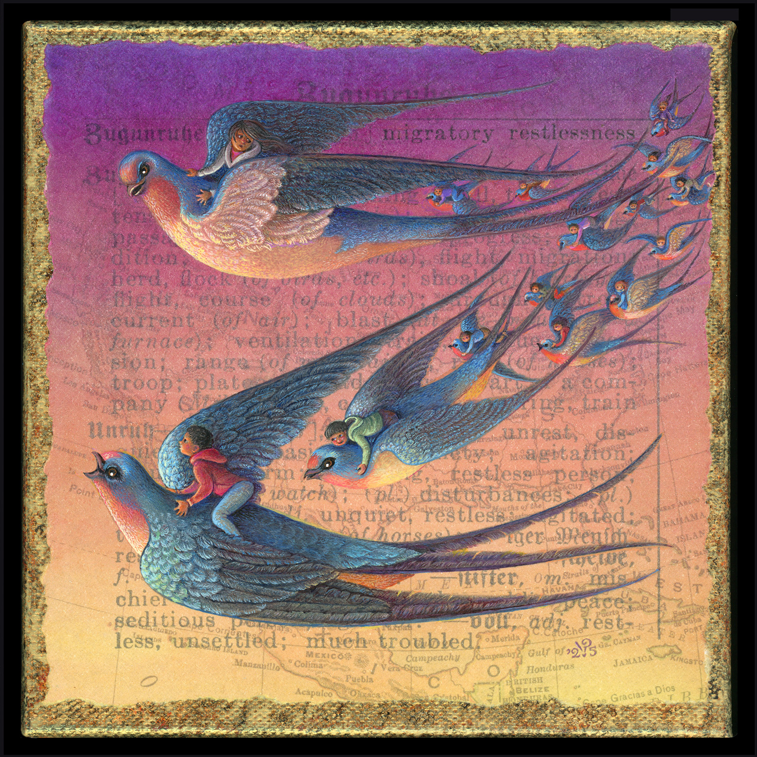 with Anu GargEach year I send a handful of words to the artist Leah Palmer Preiss and then... I wait. Inspiration cannot be rushed. While waiting, I ponder our roles in this world. I respect all skills from plumbers to programmers, but artists occupy a special frame in my heart. A plumber can fix a leak or clog in an hour (and thank goodness for that!), and you soon forget about it. But an artist creates a portrait that lingers in your memory for years. I admire anyone who follows their creative compass. It’s easier to get hired to fix a faucet than to paint a portrait, yet artists keep choosing the path where the pay is uncertain but the passion is unmistakable. Are you an artist? Tell us about your craft, whether you work with paints or pixels, clay or code, wood or marble, or something that defies tidy categories. Share below or email us at words@wordsmith.org. Please include your location (city, state). And while you browse this week’s illustrated words, if Leah’s art brings you delight, let her know at curiouser@mindspring.com. So often we admire quietly, but we all need a splash of appreciation now and then. See her previous years’ art here. zugunruhe